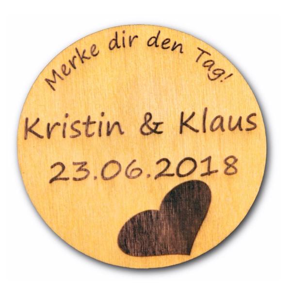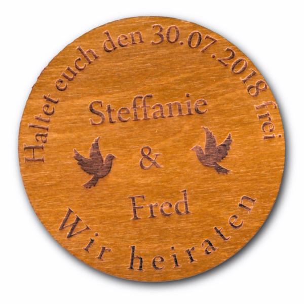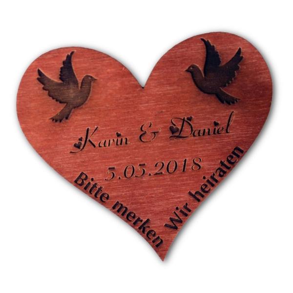 Unsere „Save the Date” Einladungskarten gibt es in zwei bezaubernden, natürlichen Farbnuancen, Holz Pur oder Nuss, Ihr habt die Wahl! Jede Karte hat eigene, einzigartige Maserungen und leichte Farbabänderungen, die sie einzigartig aussehen lässt - daher ist jede Karte ein wahres Unikat. Wir bieten Euch die „Save the Date” Einladungskarten in klassischer runder oder verspielter herzförmiger Form an. Die Größe der Karte beträgt ca. 7cm x 7 cm und ermöglicht somit ein problemloses und kostengünstiges Versenden der Karten in einem Briefumschlag der Größe C6. Die Gravur der Karten erfolgt mit unseren Lasern, dadurch lassen sich Millimeter genaue Linien gravieren und schneiden, für garantierte Perfektion bis ins letzte Detail. Der Clou - Unsere innovativen, exklusiven Einladungskarten verfügen über einen hochwertigen Magnet auf der Rückseite - perfekt für das Anbringen am Kühlschrank oder der Magnetpinnwand.